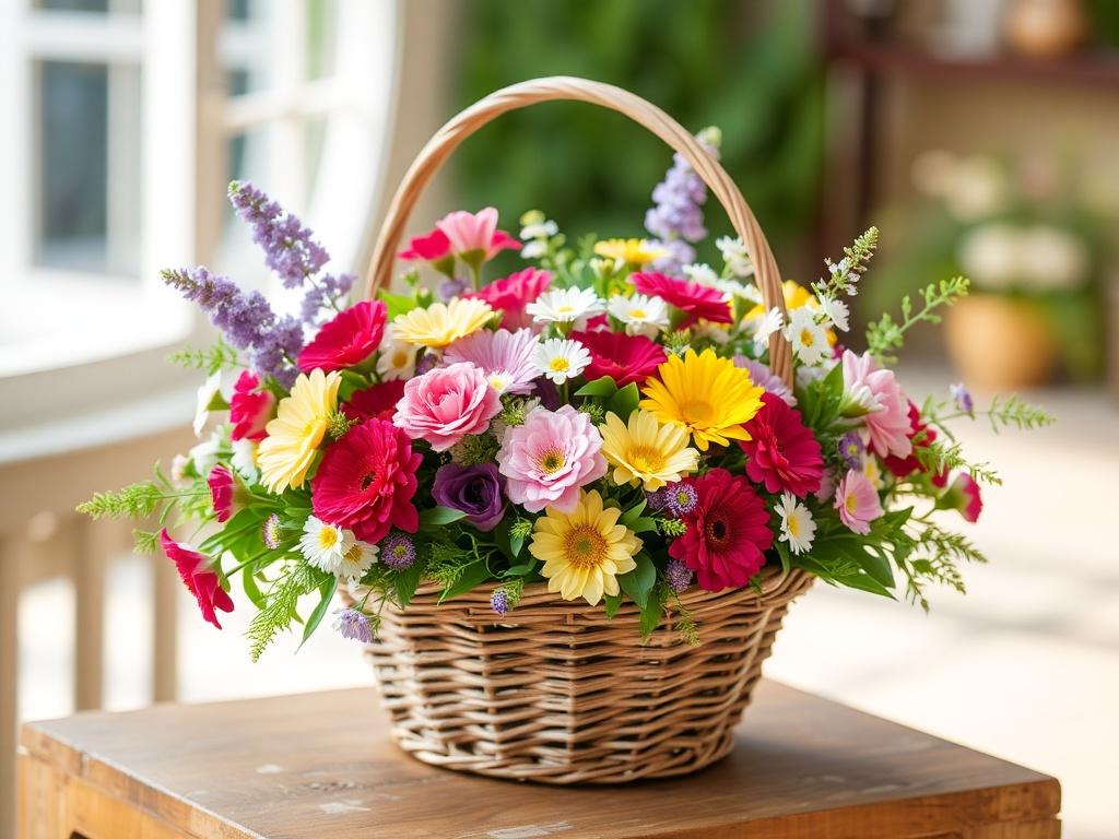 Кроме того, корзина позволяет комбинировать разные фактуры: крупные цветы, компактные соцветия, декоративную зелень и заполняющие элементы. Это даёт стилистическую гибкость: от строгой классики до свободной винтажной композиции.